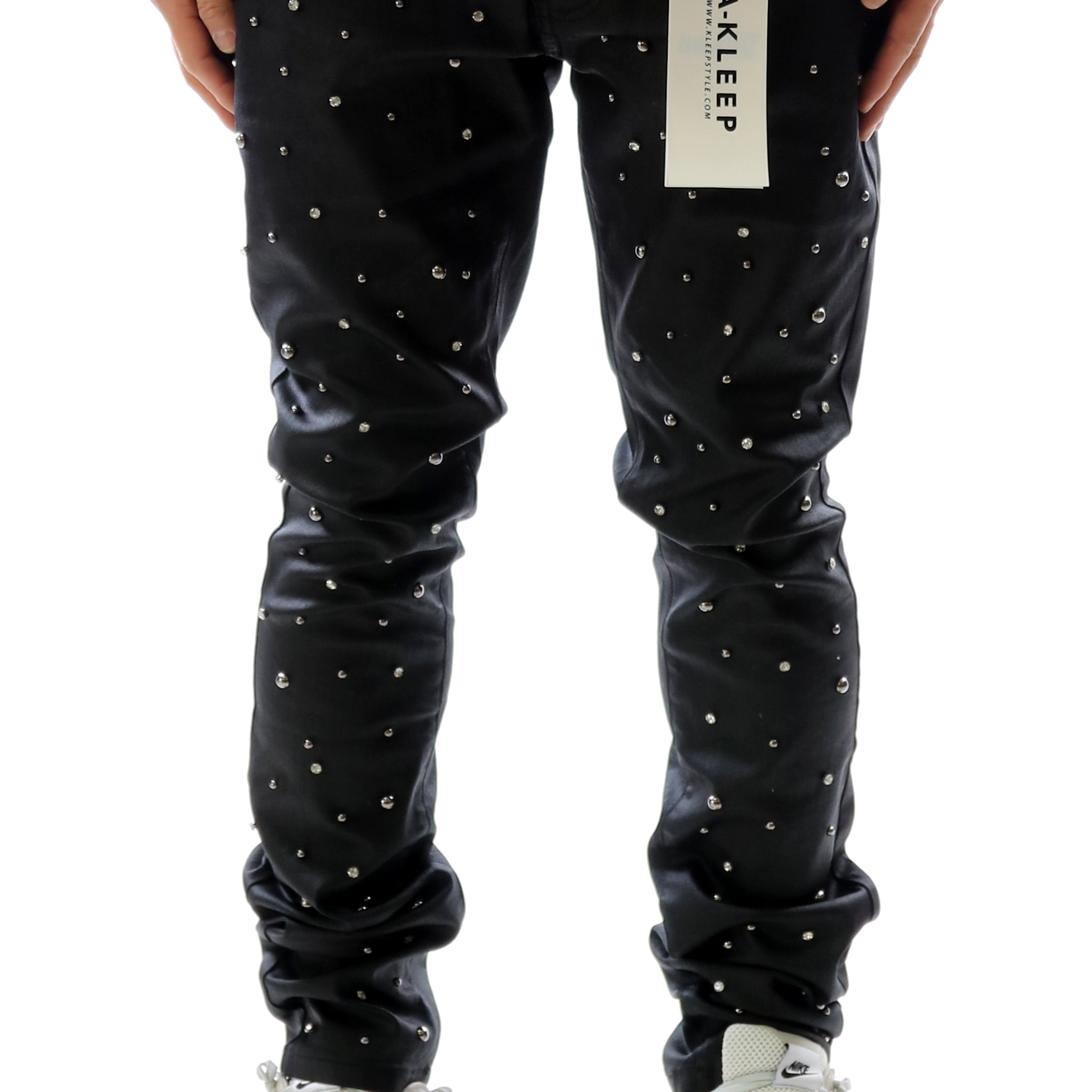CLAY Men's Premium Wax Coated Skinny Denim Pants with Crystal Stud in front