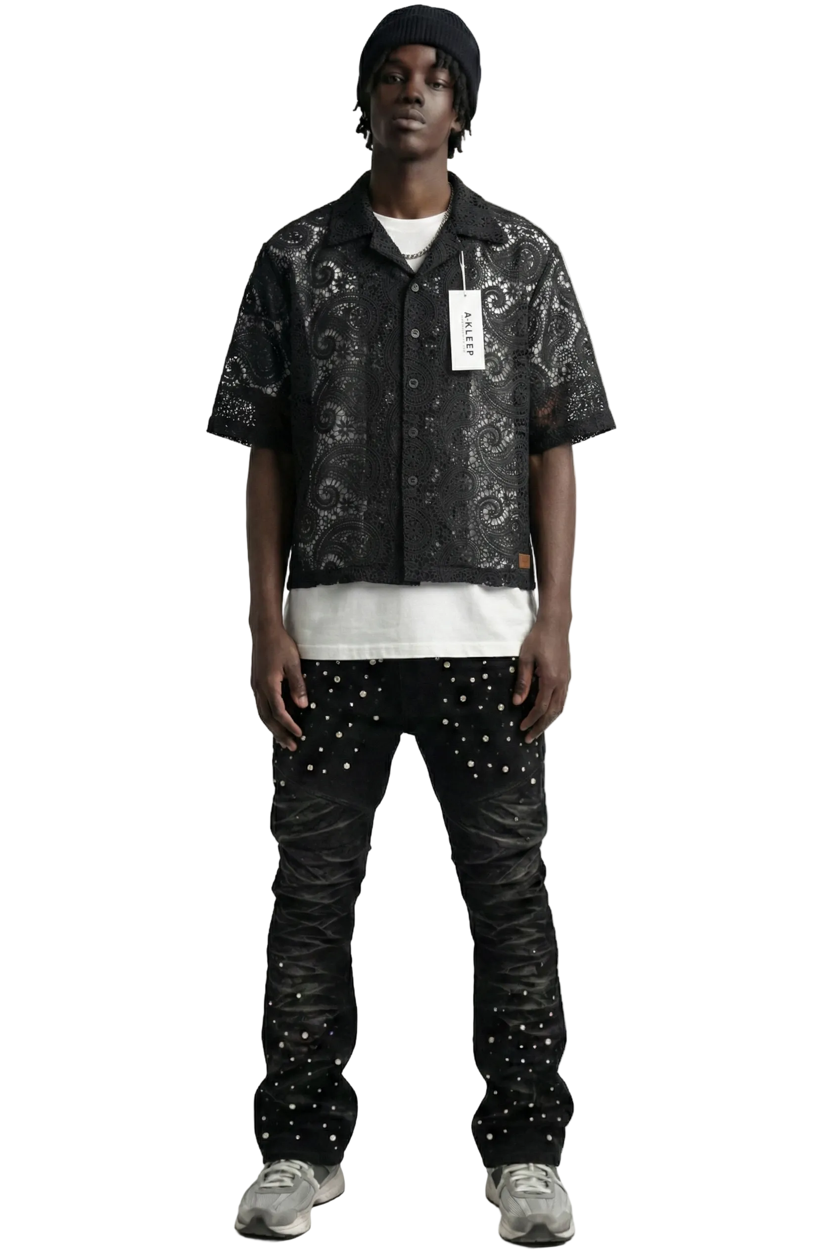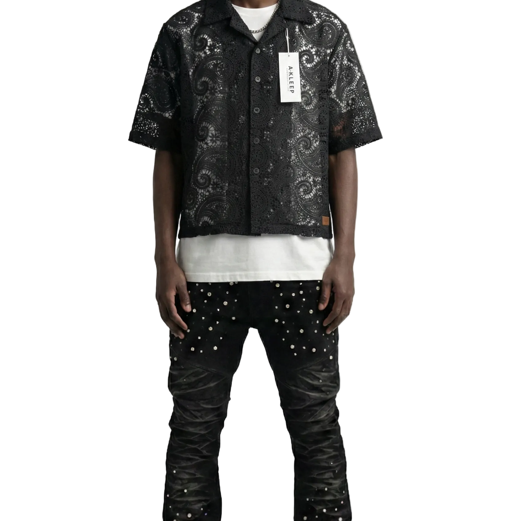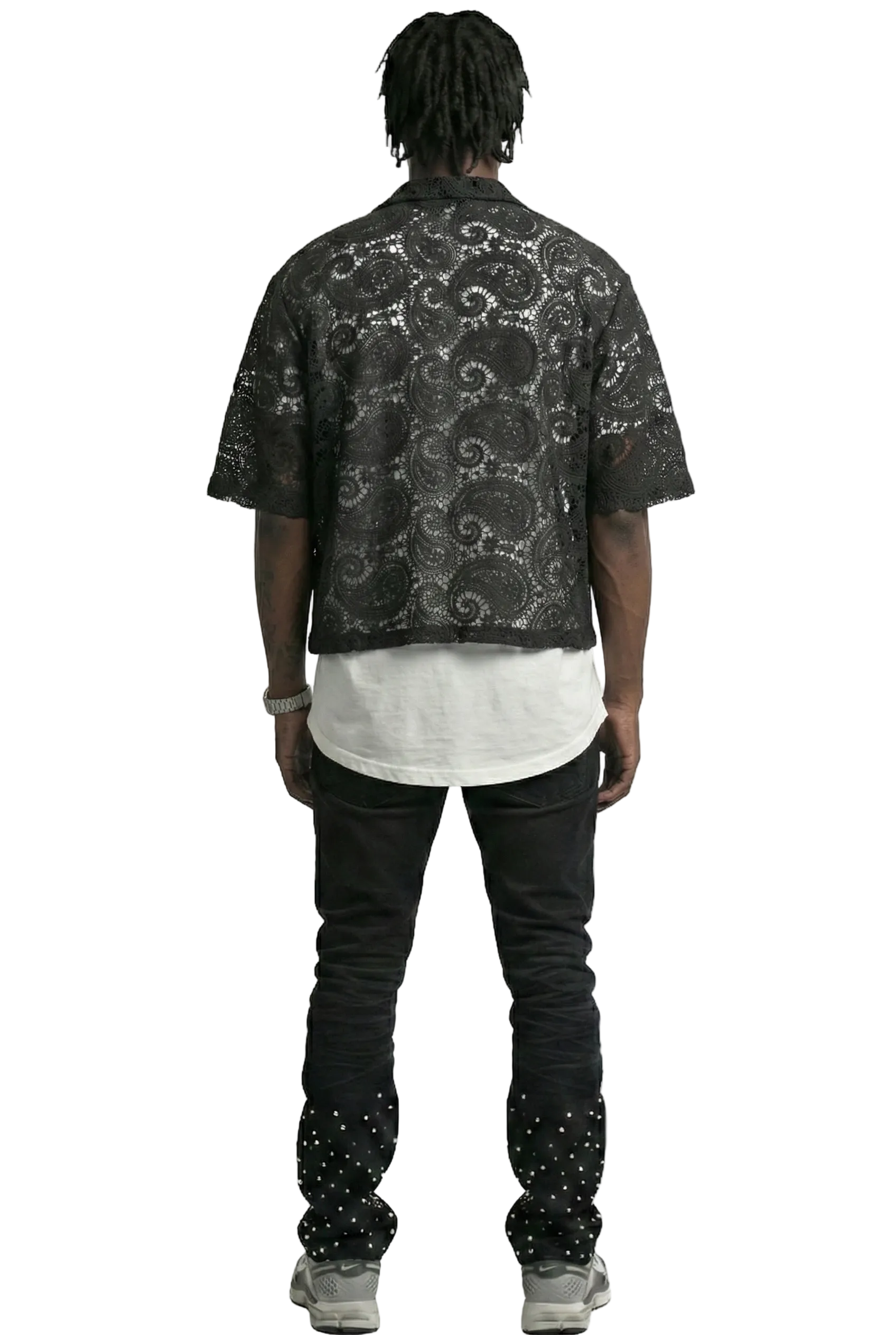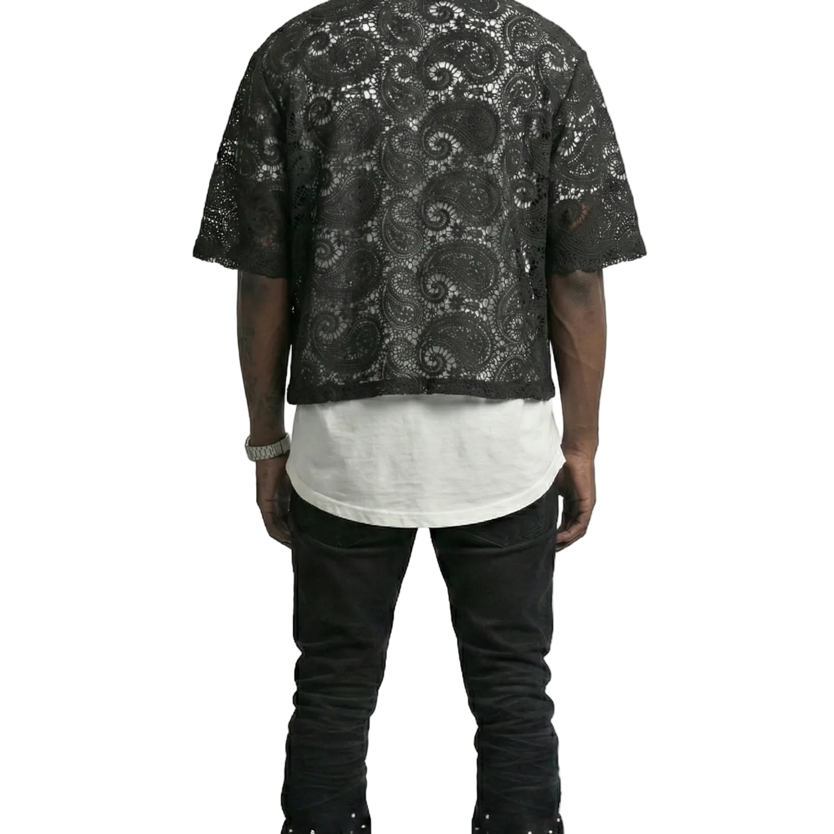 ELUX Paisley Mesh Crop Top Short Sleeve Buttondown Shirt